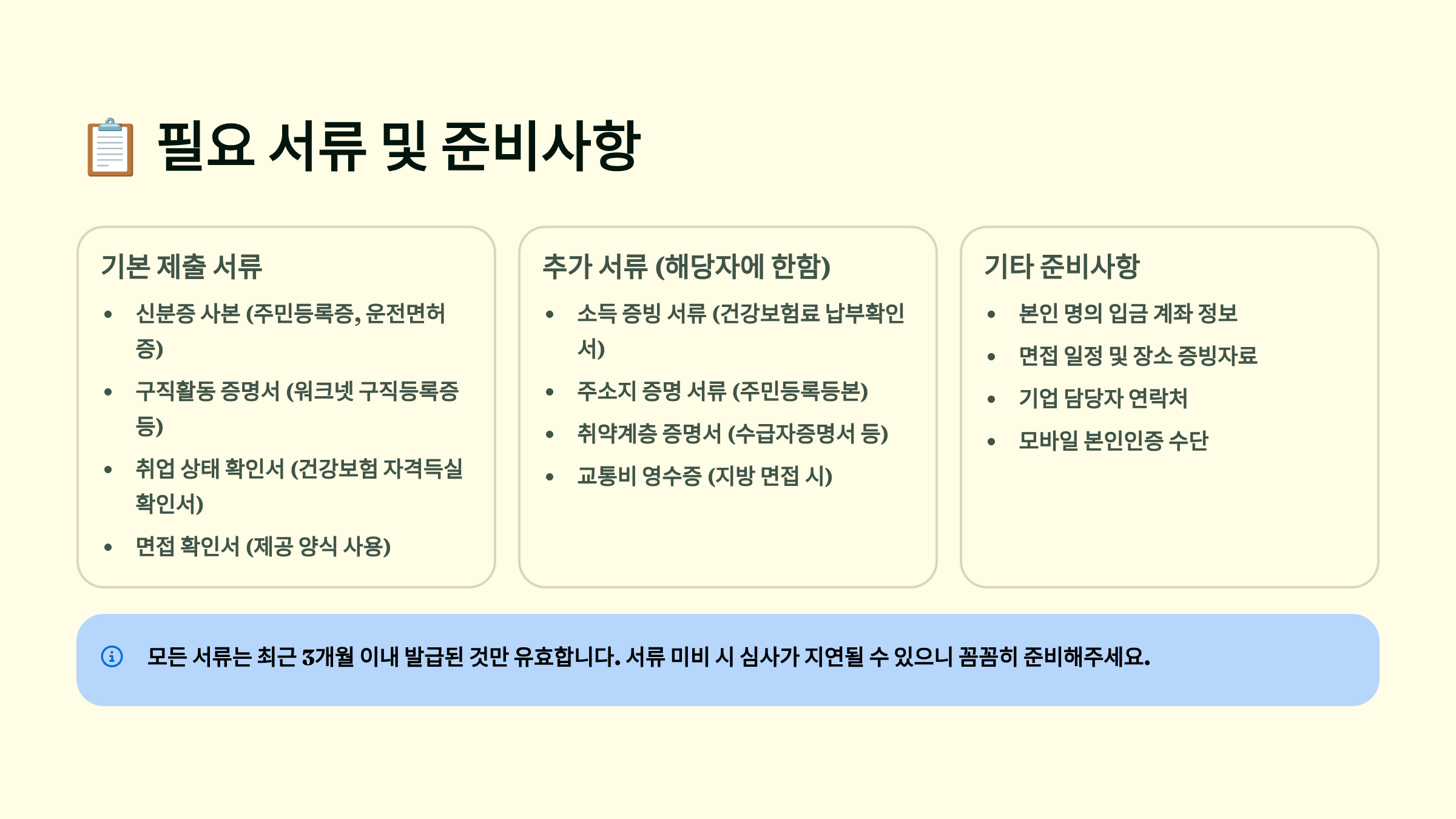 가장 중요한 서류는 면접 확인서예요! 회사에서 발급한 공식 면접 확인서가 가장 좋지만, 면접 안내 이메일이나 문자 메시지 캡처본도 인정돼요. 면접 일시, 장소, 회사명이 명확히 나와 있어야 해요. 만약 회사에서 확인서 발급을 거부한다면 담당자와 통화 녹음도 증빙으로 인정된답니다!