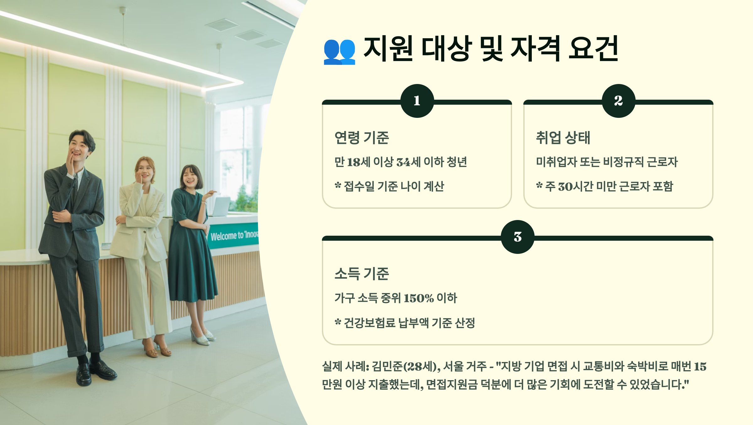 2025년 청년 면접지원금의 지원 대상이 대폭 확대되었어요! 🎯 이제 만 15세부터 34세까지의 청년이라면 누구나 신청할 수 있답니다. 기존에는 만 29세까지였는데, 5세나 확대된 거예요. 이는 최근 늦은 나이에 취업을 준비하는 청년들이 늘어난 현실을 반영한 결과랍니다.