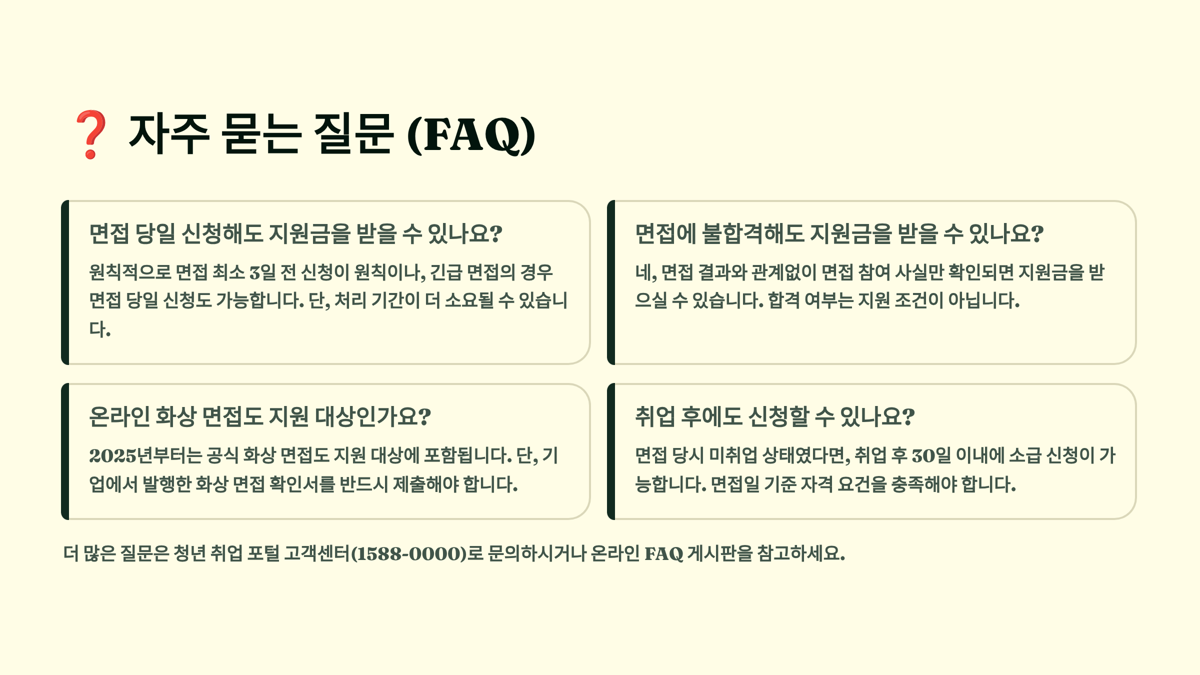 지급 보류나 반려 사유도 알아두세요. 가장 흔한 반려 사유는 면접 확인서 불충분, 신청 기간 초과, 중복 신청 등이에요. 특히 면접을 취소했거나 불참한 경우에는 반드시 신청을 취소해야 해요. 허위 신청으로 판명되면 향후 2년간 신청이 제한될 수 있어요!
