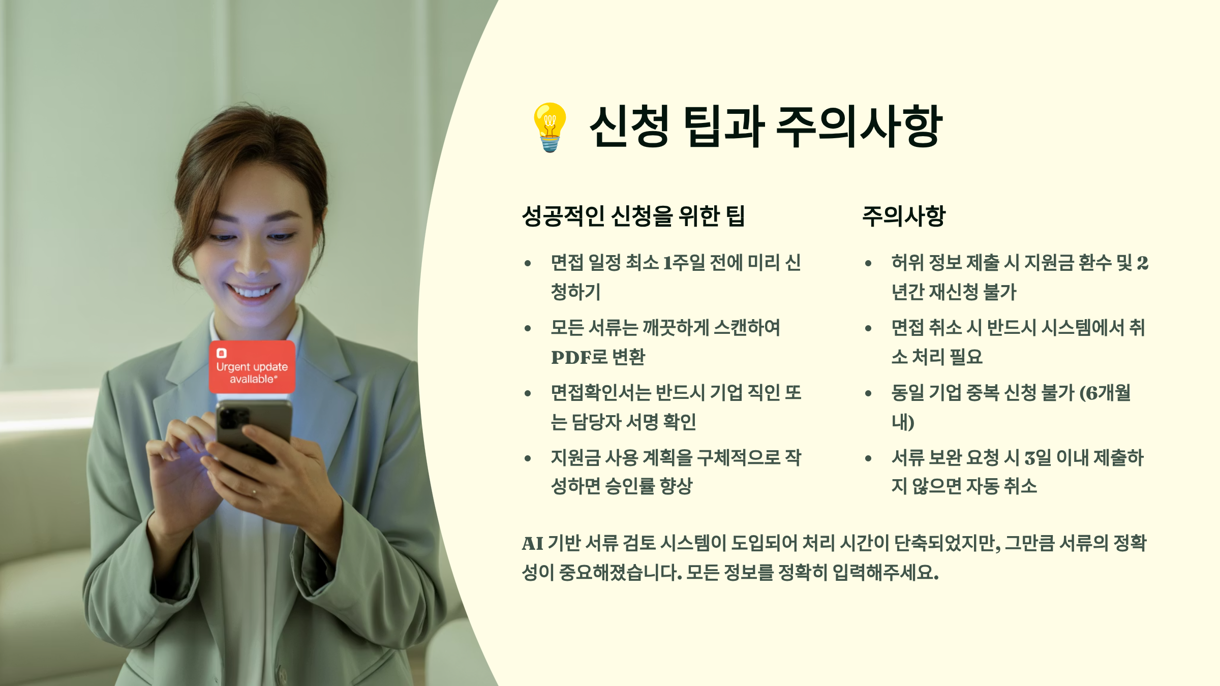첫 번째 팁은 '면접 일정 관리'예요. 같은 날 여러 회사 면접을 잡으면 1회로만 인정되니, 가능하면 다른 날짜로 분산시키세요. 예를 들어 월요일 오전, 화요일 오후 이렇게 나누면 각각 지원받을 수 있어요. 단, 같은 회사의 1차, 2차 면접은 다른 날이어도 각각 신청 가능해요!