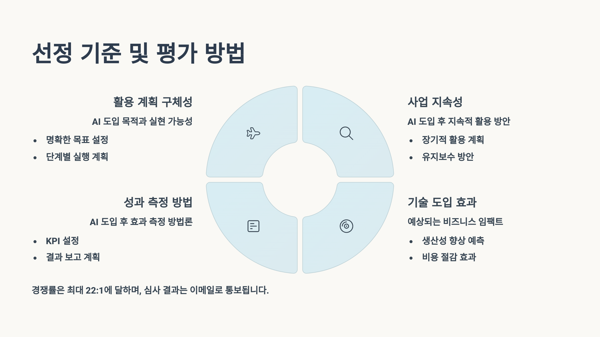 서류 평가의 핵심은 'AI 도입 타당성'이에요. 단순히 AI를 도입하고 싶다는 막연한 계획이 아니라, 현재 업무의 문제점을 명확히 파악하고 AI로 어떻게 해결할 것인지 구체적으로 제시해야 해요. 예를 들어 "품질 검사에 하루 8시간이 소요되는데, 비전 AI 도입으로 2시간으로 단축하고 정확도를 95%로 향상시키겠다"와 같이 정량적 목표를 제시하는 것이 좋아요. 📊
