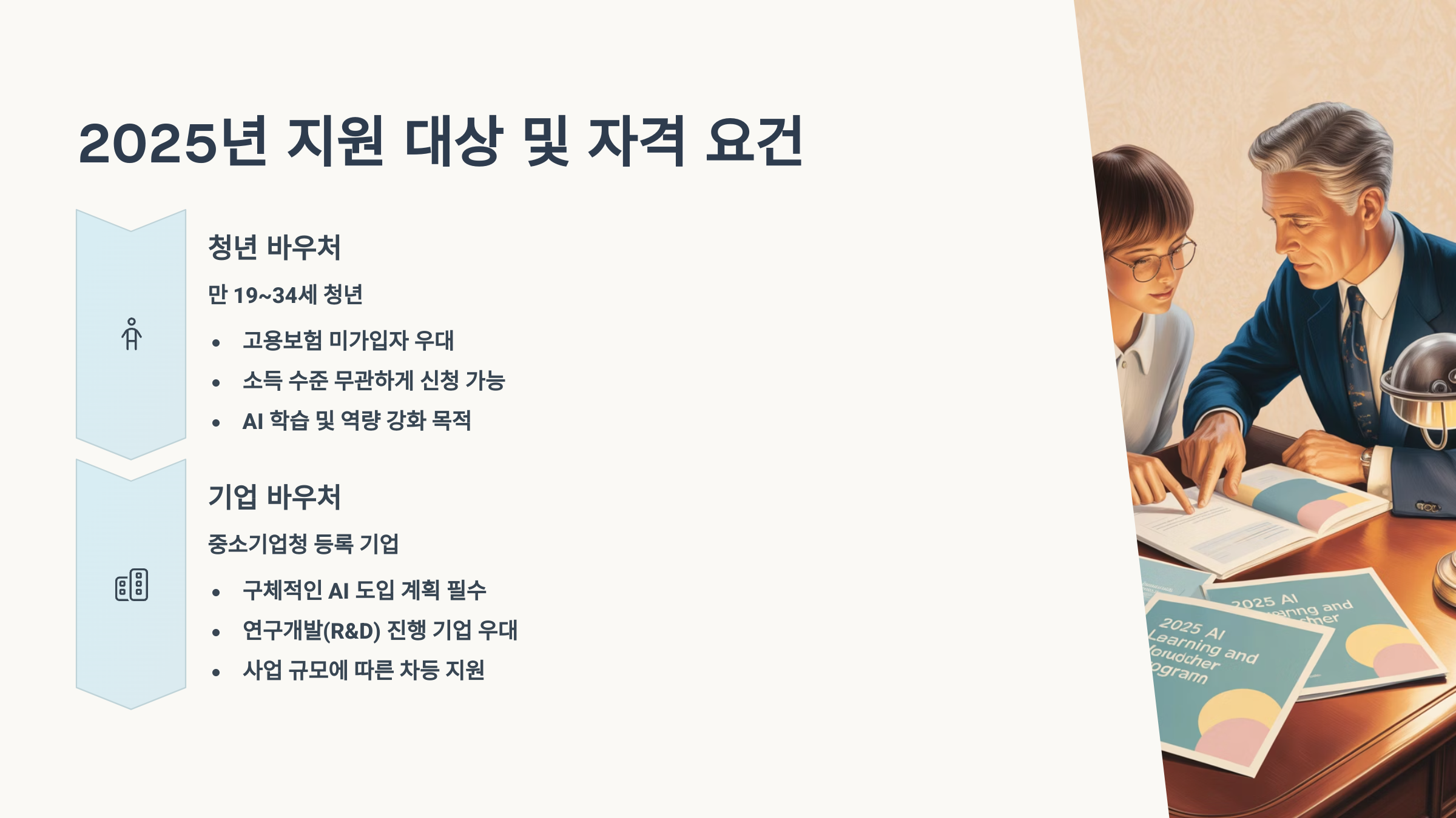 2025년 AI 바우처 지원 대상은 크게 확대됐어요. 기본적으로 중소기업기본법상 중소기업과 창업 7년 이내 스타트업이 주요 대상이지만, 올해부터는 중견기업도 일부 참여가 가능해졌답니다. 특히 제조업, 서비스업, 유통업, 의료·바이오, 금융, 물류, 농업 등 거의 모든 산업 분야가 지원 대상에 포함돼요. 단, 부동산업, 주점업 등 일부 업종은 제외되니 주의해주세요! 🏢