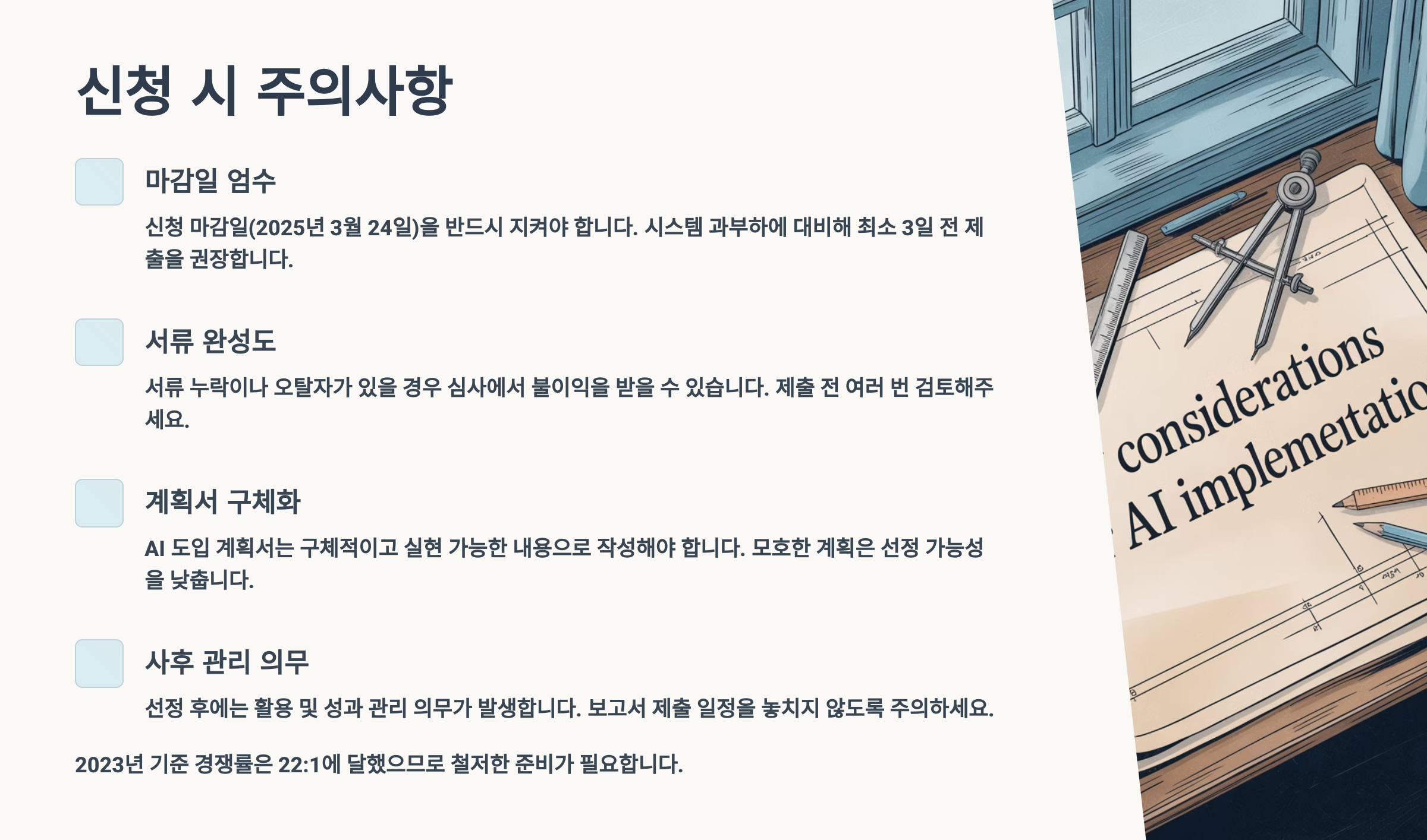 신청서 작성 시 흔히 하는 실수들을 정리해봤어요. 첫째, AI 기술 용어를 남발하면서 정작 구체적인 활용 방안은 제시하지 못하는 경우가 많아요. 평가위원들은 전문가이므로 겉치레보다는 실질적인 내용을 중시한답니다. 둘째, 예산 계획을 비현실적으로 작성하는 경우예요. 시장 가격을 조사해서 합리적인 예산을 편성해야 해요. 셋째, 추진 일정을 너무 촉박하게 잡는 것도 문제예요. AI 도입은 시간이 필요한 작업이니 여유 있게 계획하세요! 📝